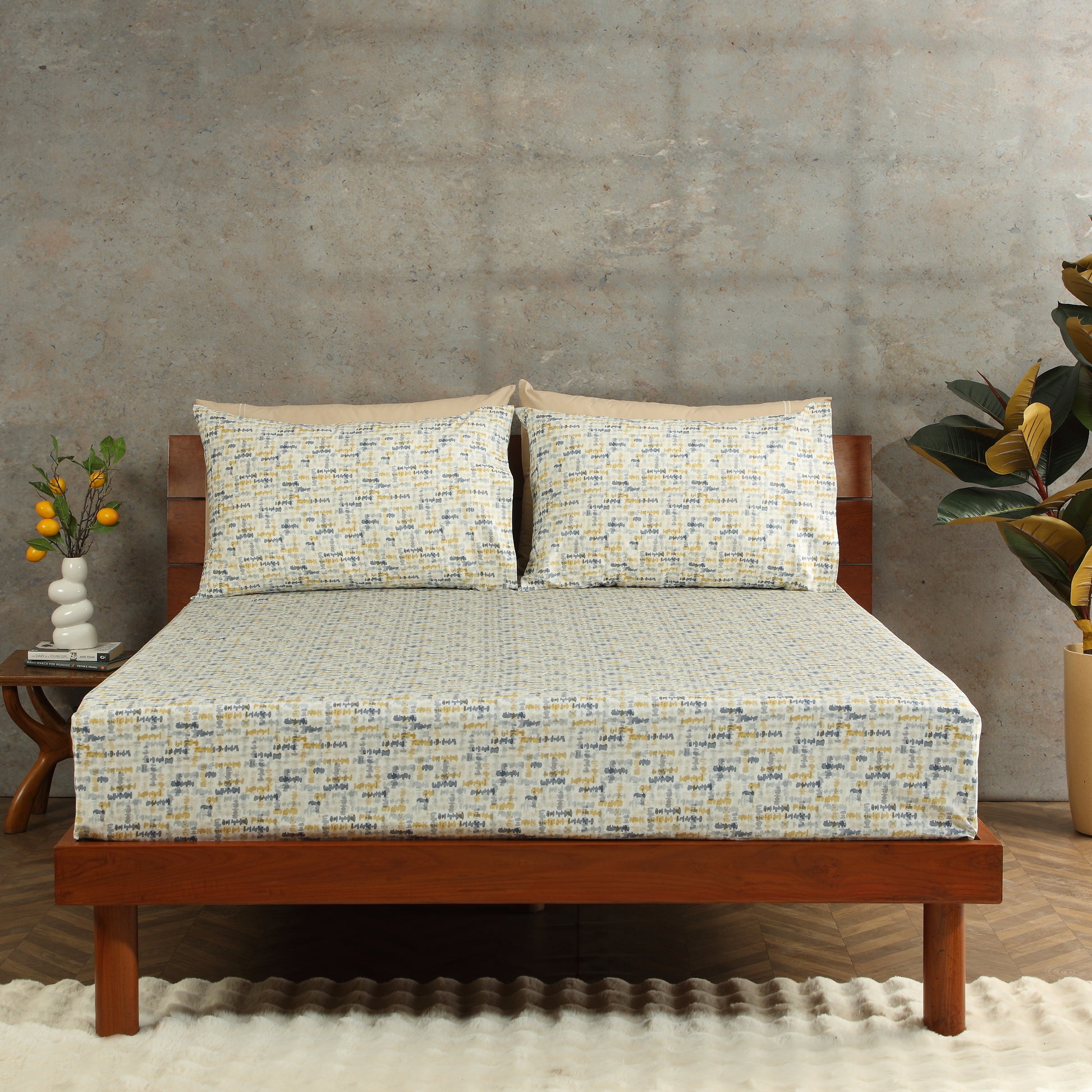 Elevate your sleep experience with this distinctive and versatile digitally printed sheet set. The design features an abstract geometric design blending blue and natural hues, adding a modern touch to any space.